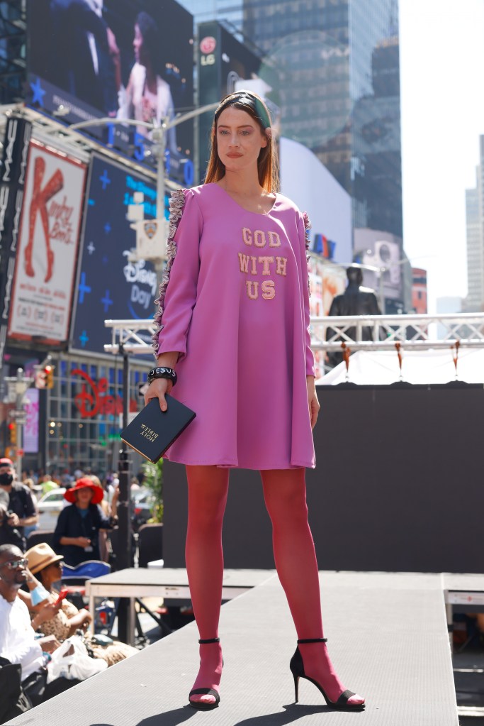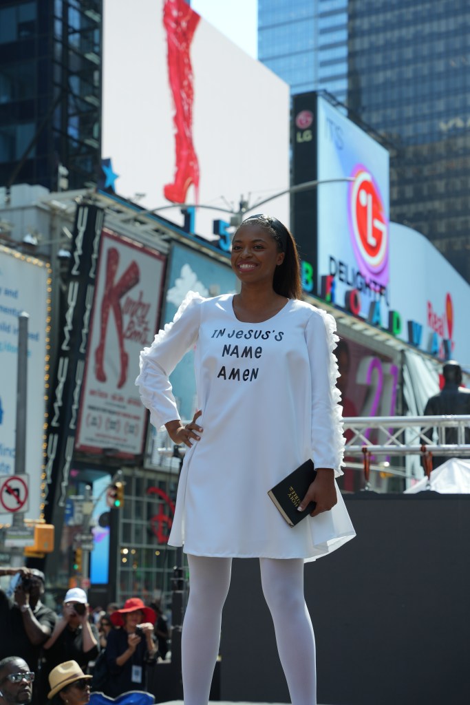 Model Angelique holds the Bible while wearing JulissaDesigns Collection in Times Square New York City during New York Fashion Week. Photo : Oliver Archer