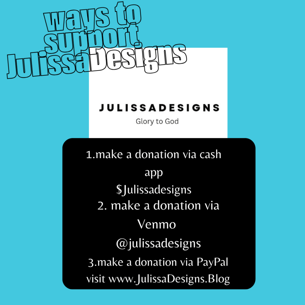 Hello everyone, making a donation to JulissaDesigns Glory to God can go a long way. Your monetary donation can help us reach more people using our gifts and talents, whether by creating a Podcast Episode to create our next collection to be showcased during New York Fashion Week.